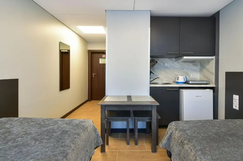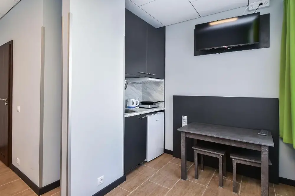 W pokoju hotelowym znajduje się niewielki aneks kuchenny wyposażony w kuchenkę, czajnik i przybory kuchenne. Można więc także przygotować na miejscu własne śniadanie itp.